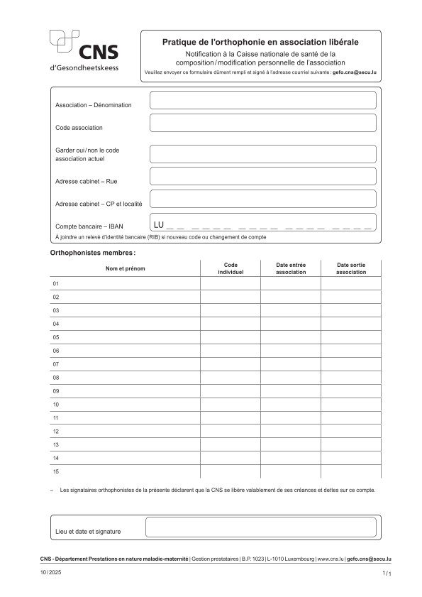 Il s'agit du formulaire qu'un prestataire utilise pour: Demander un code prestataire Communiquer un nouveau compte bancaire ou changement du compte bancaire Communiquer un changement d'adresse de cabinet Déclarer la fin de son activité au Grand-Duché de Luxembourg